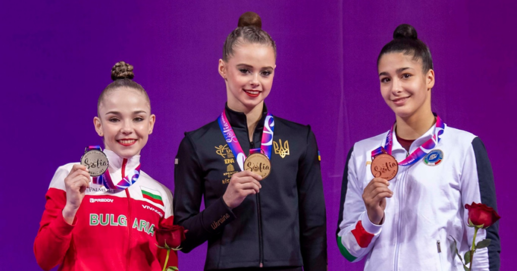Sofiia Ilteriakova ficou de costas para as bandeiras durante cerimônia de premiação em Sofia